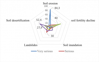In this region, farmers perceived five existing forms of land degradation, in which soil degradation was identified as the most predominant form followed by desertification, inundation, landslides, and soil fertility decline (Figure 2).