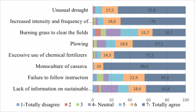 The respondents identified eight reasons that caused land degradation in the region (Figure 3) in which long cassava monoculture and excessive use of chemical fertilizers are the main causes.