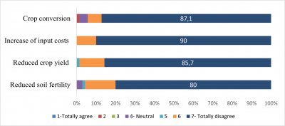Regarding the land degradation consequences (Figure 4), all of the respondents confirmed that land degradation leads to the increase in input costs for agricultural production e.g. fertilizers, pesticides, etc. in compromising yields and income. They also identified crop conversion from cassava to other alternative tree crops, such as cinnamon, reduced cassava yield and declined soil fertility as impacts of land degradation.