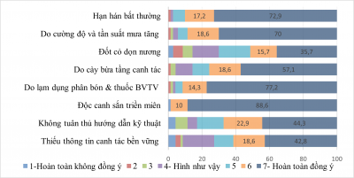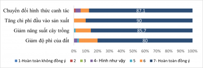 Các ảnh hưởng chính của thoái hóa đất đến sản xuất nông nghiệp được liệt kê ở Hình 4. Theo đó, toàn bộ người dân đều cho rằng chi phí đầu tư vào đất (phân bón, thuốc bảo vệ thực vật và công chăm sóc) nhiều hơn trước do ảnh hưởng của thoái hóa đất. Ngoài ra, do chất lượng đất giảm xuống ảnh hưởng đến sản lượng sắn và kinh tế hộ, trong vòng 5 trở lại đây, người dân bắt đầu chuyển đổi một phần hoặc toàn bộ diện tích trồng sắn trước đây sang trồng quế.